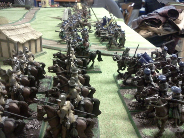 Carl's central infantry in the foreground, and his left flank cavalry division ready themselves for what we both suspected might be a savaging of their counterparts across the table.